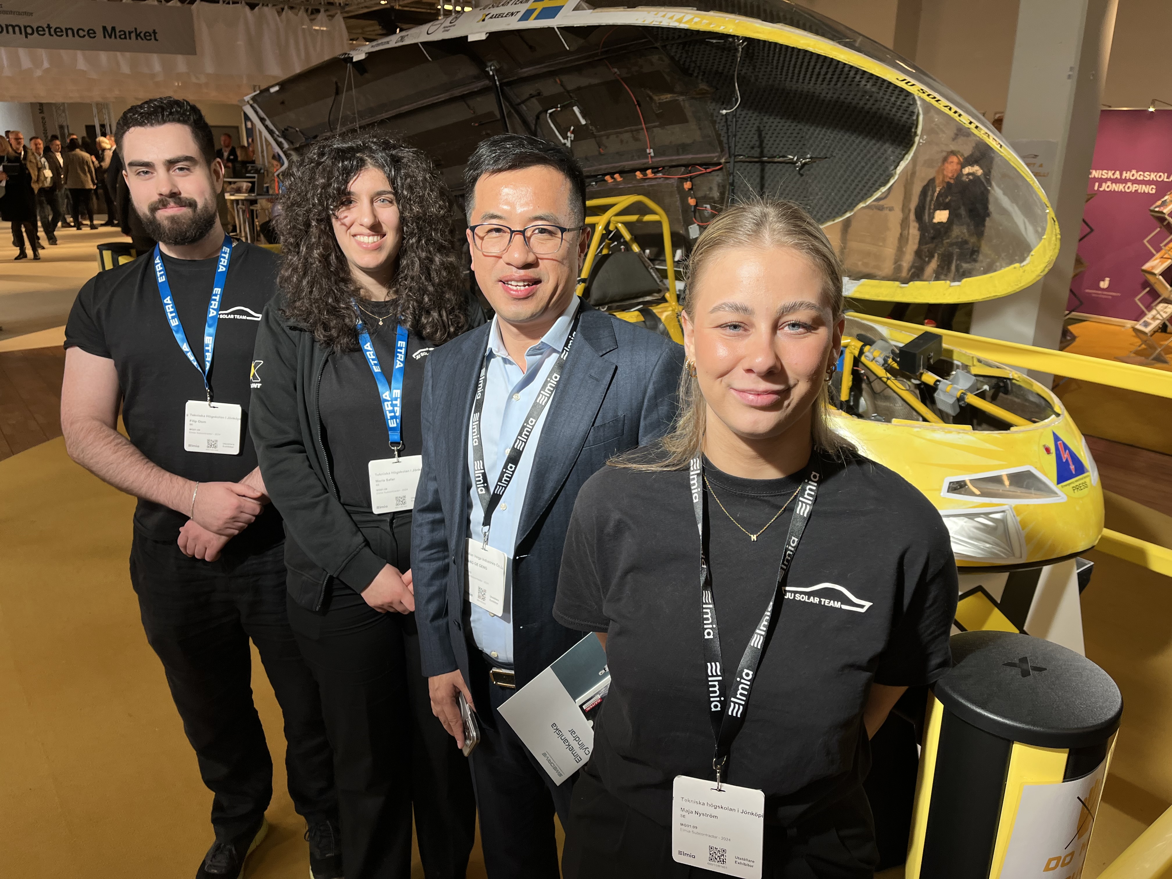 Maja Nyström of JU Solar Team (second from left) talking about the solar car with her father Peter Nyström and his colleague Jennie Lindkvist (far right) from Kvistberga Group and Johanna Bastman from Marab.