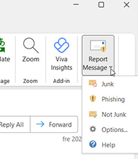 - Rapportera misstänkta meddelanden via menyn Rapportera -> Rapportera nätfiske längts upp till höger i det öppnade mejlet. Mejlet raderas då och information skickas till Microsoft