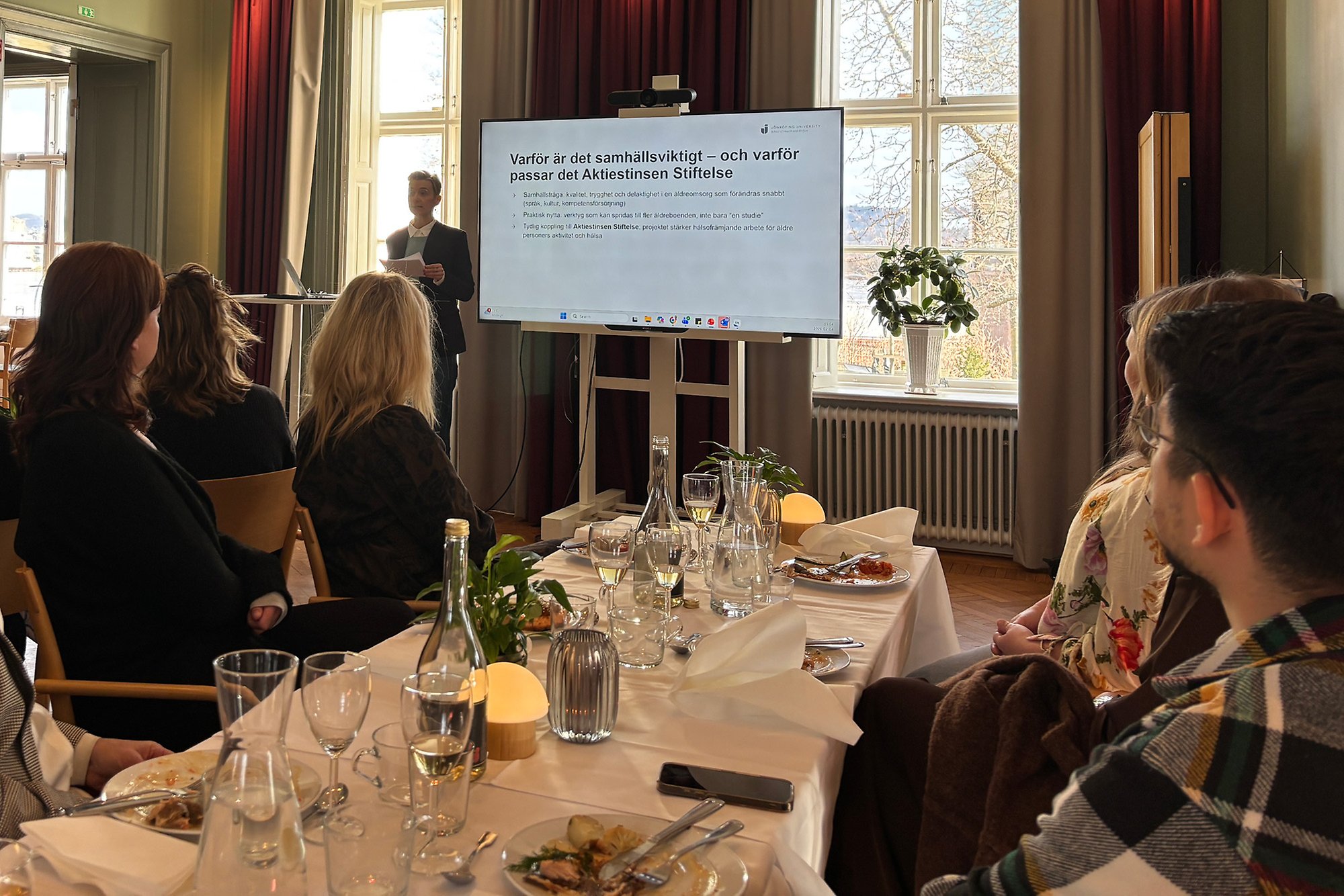 Ett av de tilldelade projekten presenterades av Manuela Schmidt, forskare vid Hälsohögskolan. Hon inledde med att rikta ett varmt tack till fonden och beskrev projektets fokus, att undersöka hur både äldre personer och personal upplever meningsfulla aktiviteter i en multikulturell äldreomsorg.