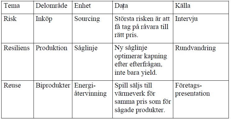 Under företagsbesöken samlar vi in data genom anteckningar, foton (där det tillåts), presentationer och rundvandringar. All information struktureras i ett datainsamlingsprotokoll som innehåller de tre teman för projektet: Risk, Resiliens och Reuse. Protokollen följer följande övergripande struktur: